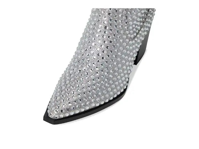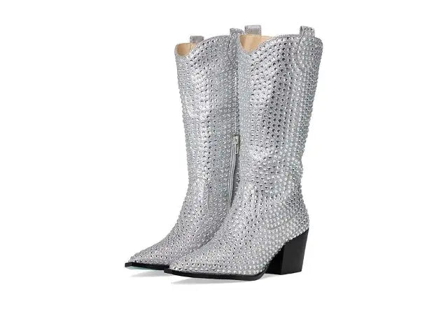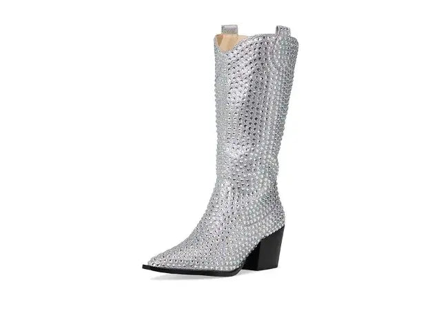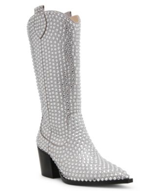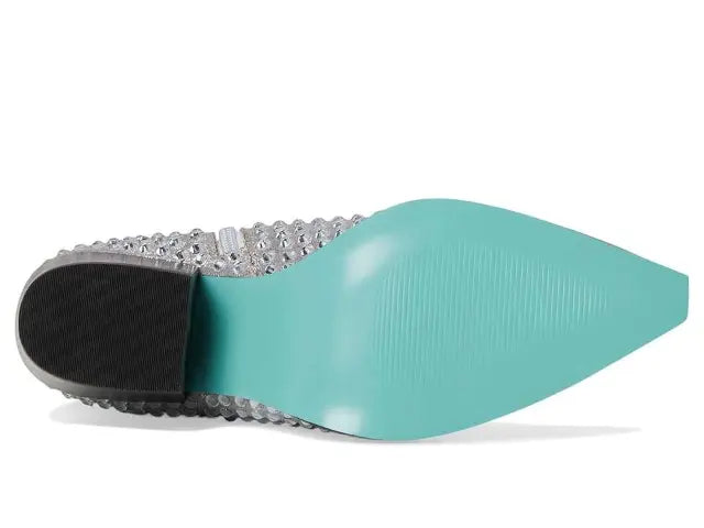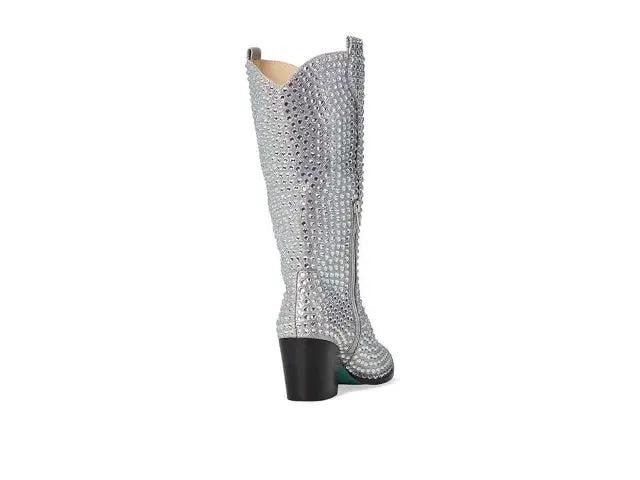 Blue by Betsey Johnson Randy - Women's Boots : Silver : Add some bling to the classic cowboy boot style with the Blue by Betsey Johnson Randy western boot. Whether you're heading to a country concert, a festival, or just looking to make a statement, these sparkly boots are a perfect choice. This snip toe pair has a mid-calf profile with allover studded design and side zipper for easy entry. ; Synthetic upper. ; Synthetic rubber lining and insole. ; Side pull loops. ; Block heel. ; Rubber outsole. ; Imported. Measurements: ; Heel Height: 2 1 2 in ; Weight: 1 lb 7 oz ; Shaft: 13 in ; Product measurements were taken using size 8, width M. Please note that measurements may vary by size. | Blue by Betsey Johnson Randy Women's Boots Silver : 7.5 M, Rubber