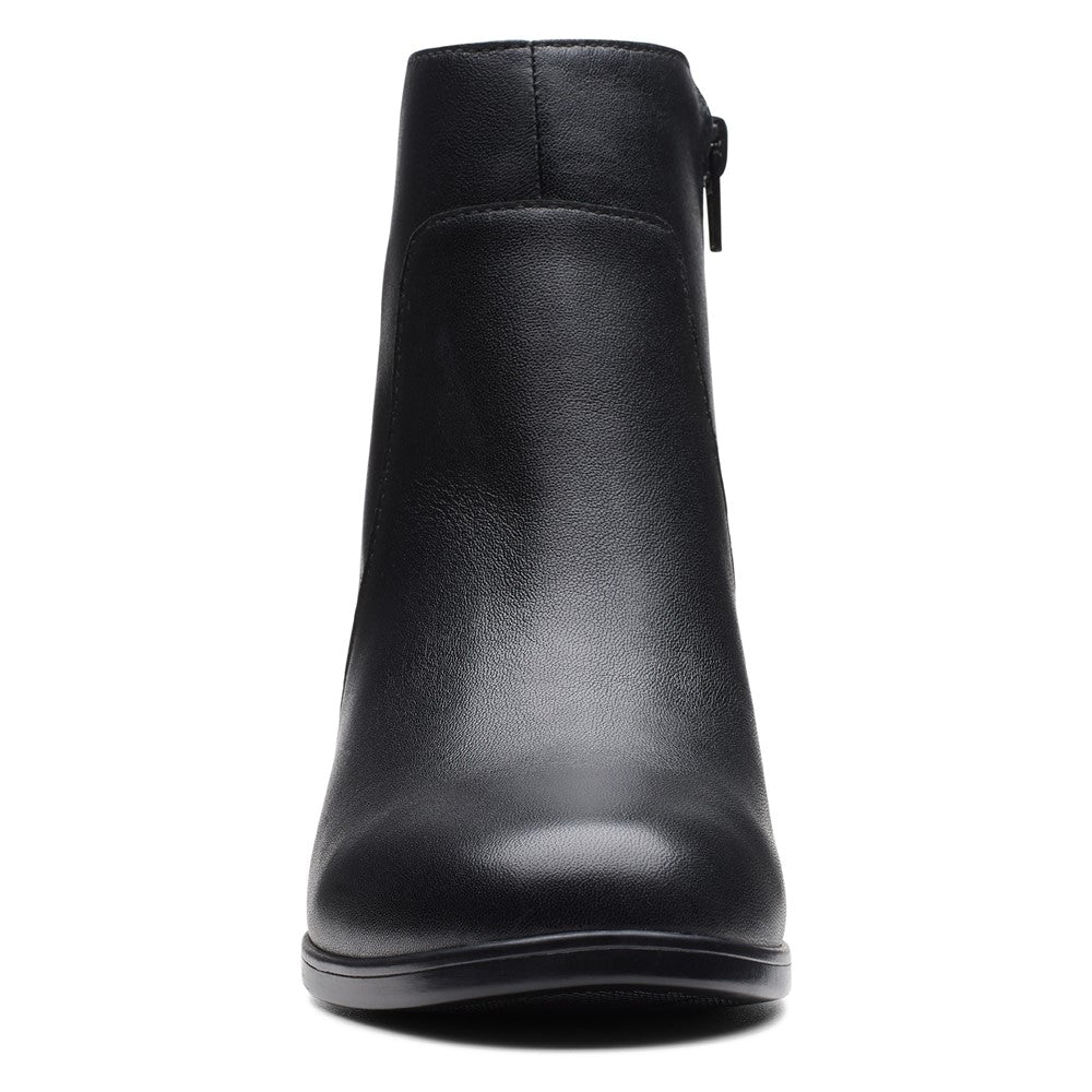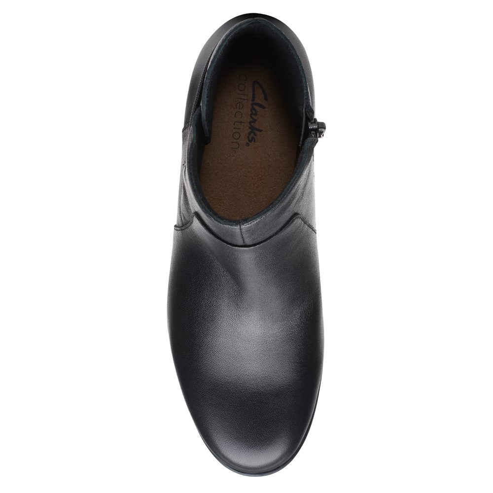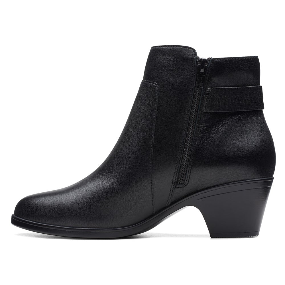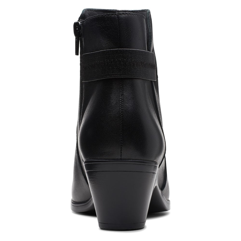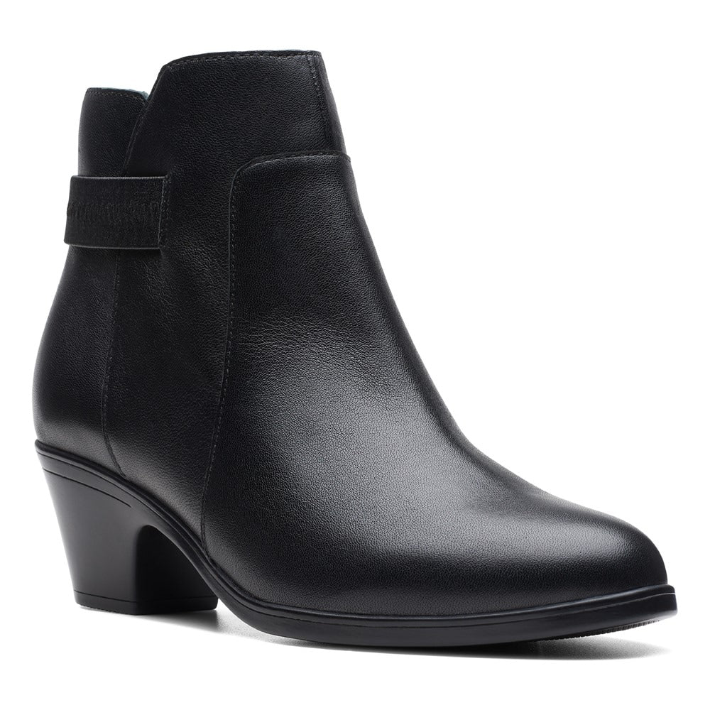 Clarks pairs straps wrapping around the ankles over walkable heels in the go-to style of the Emily 2 Holly booties.