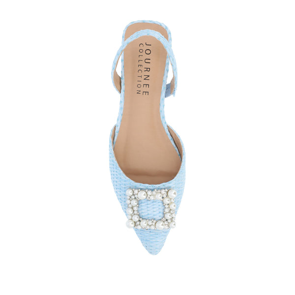 Introducing the Hannae Journee—an effortlessly stylish and comfortable choice. With its pointed-toe and flat sole design, this style exudes a chic and versatile vibe. The pull-on feature ensures easy wear, complemented by a padded insole crafted for comfort, all adorned with elegant pearl hardware for a touch of sophistication, making the Hannae a standout in both fashion and convenience.